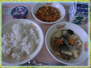 台風8号接近によるフェリーの欠航で,明日から給食内容に一部変更があります。