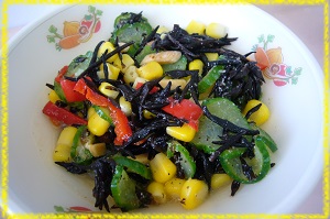 今日の給食では,ひじきと野菜たっぷりのカラフルなサラダと組み合わせました。