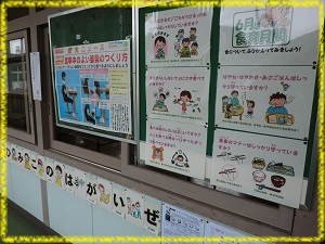 給食室入口の掲示板も6月の「食育月間」や今月の給食目標にちなんだものになっています。学校へお越しの際はぜひご覧ください。