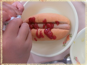 パンに,キャベツ・ポークフランクをはさんで,ケチャップをかけて・・・