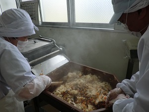 調理場では,自慢のガス連続炊飯機で炊き込みごはんも炊いています。