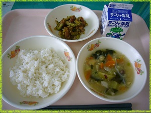 〇さつまいものみそ汁 7月に実施したにがうり料理「にがうりの揚げ煮」は,にがうりが苦手な児童・生徒も食べることができたと大人気でした。