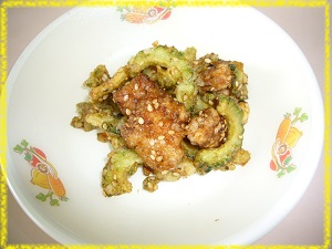 今回は衣をつけて油で揚げたにがうりと豚肉を梅肉入りのソースで味付けしました。
