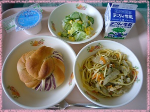 生のごぼうをたっぷり使った「ごぼう入りペペロンチーノ」はごぼうの香りと歯ごたえを感じることができるよう,調理員さんが上手に調理してくださいました。