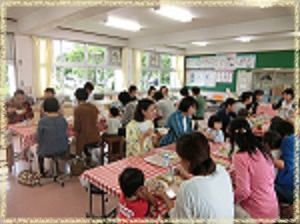 給食試食後は1年生の教室に移動し,給食の準備や食事の様子を参観していただきました。おうちの方々に見られてちょっと緊張ぎみの1年生でした。