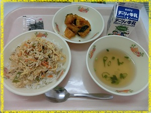 1年生は給食で初めて食べる鶏飯でした。