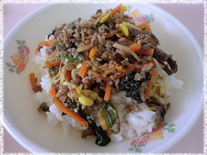 牛肉・野菜などの具をコチュジャンという甘辛みそで味付けし,ごはんにかけてよく混ぜていただきます。