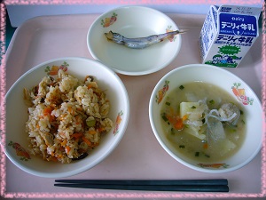 今日はしいたけ・しめじ・えのきだけなどたっぷりのきのこをごはんと一緒に炊き込みました。調理場のガス炊飯器で炊く炊き込みご飯はとてもおいしいと好評です。