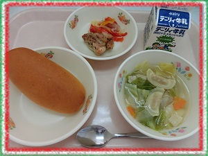 チキン香草焼きに添えた「パプリカのマリネ」は量は少しずつでしたが,いろどりが美しく,子どもたちも残さずしっかり食べてくれました。