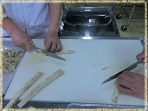ごぼうの食感を生かすために,縦半分に割って,すこし厚めに斜め切りしました。
