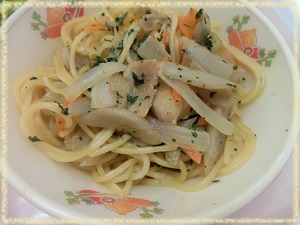 オリーブオイルで,にんにく・唐辛子・ベーコンなどと一緒に炒め,しお・こしょう・薄口醤油で味を調え,ゆでたスパゲティとからめました。