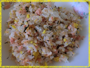 屋久島産の新茶をから炒りして,鮭フレーク・卵そぼろとともにごはんに混ぜ込みました。