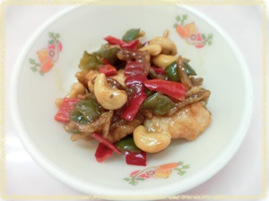 カシューナッツ・ゆでたピーマン・揚げたとり肉とごぼうを,鹿児島の黒酢入りのたれでからめました。