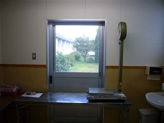 検収室では,給食食材納入の際,数量や鮮度,異物混入の有無等の確認や点検を行います。合格した食材のみ,専用容器に移し替えて,下処理室や食品保存庫に運びます。