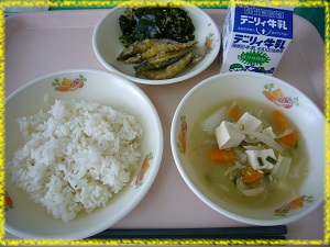 〇もやしのみそ汁 今日は鹿児島を代表する小魚「きびなご」をメインとした給食です。
