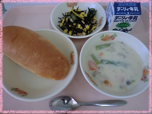 子どもたちは,パンにクリーム煮をつけて,おいしそうに食べていました。