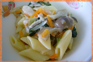 今日は,ゆでたペンネに旬のきのこたっぷりのクリームソースをからめました。