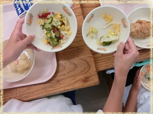 1年生⇔6年生,2年生⇔5年生,3年生⇔4年生とクラスの半分ずつ入れ替わって,給食時間を過ごしました。