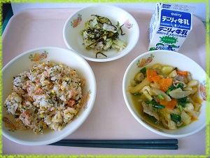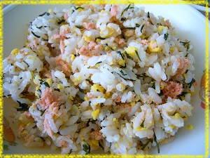 からいりしたお茶の葉を,鮭そぼろ・卵そぼろと一緒にごはんに混ぜ込みました。