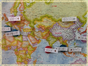 1年生の教室の世界地図には,今回の世界味めぐりの国はもちろん,行ったことがある国や,今日のヨーグルトのパッケージに書いてあった国までたくさんの印がついていました。