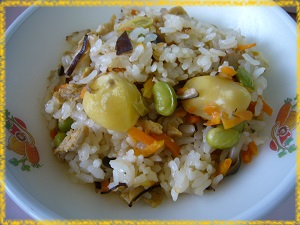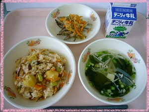 今日の炊き込みご飯は,秋に旬を迎える「栗」と「きのこ」がたっぷり入っています。