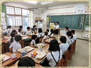 よ くかんで食べることの効能を紹介し,「みなさん,すきな給食をひとくち口に入れてください。一緒に30回かみましょう!1・2・3・4・・・30」と呼びかけました。4年生の教室では給食委員会児童の号令に合わせて,全員一斉に30回かんでから飲み込む体験をしました。