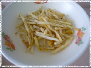 ③揚げあがったごぼうにカレー塩をふりかけ,よく混ぜて出来上がり。