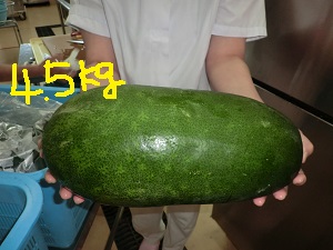 調理員さんに冬瓜を持ってもらいました。