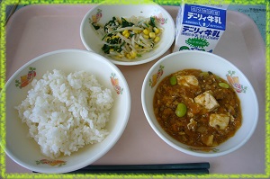 教室をのぞくと,ほとんどの児童がごはんにかけて麻婆豆腐丼にして食べていました。