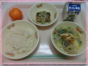 ◯ みかん今日は旬の「さば」に衣を付け油で揚げ,大根おろしだれをかけていただきます。