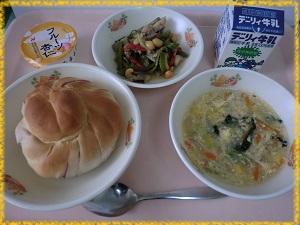 今日は,「紫いもパン」です。紫芋のペーストを練りこんだパンは甘みがありっ子どもたちにも大人気です。