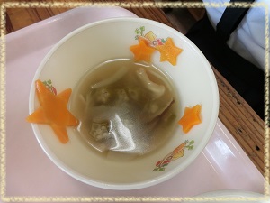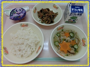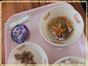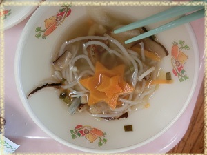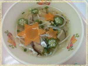 天の川に見立てた魚そうめんに,星に見立てたにんじん・オクラを入れた七夕そうめん汁と,デザートには星の形のパイナップルとナタデココが入ったゼリーを組み合わせました。