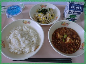 〇 ヨーグルト 今日は,大人気の麻婆豆腐です。子どもたちの様子を見ると「ごはんにかけて食べる派」「別々に食べる派」に分かれます。それぞれにこだわりがあるようです。