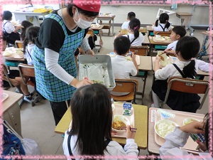 担任の先生が,「お野菜おいしいよ。もう少し食べようか!」と児童に声をかけながら,残った副食を配膳してくださっています。