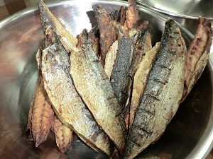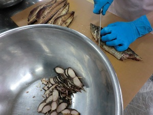 写真は屋久島産の「さばぶし」です。調理場でスライスして小骨をとり,油でソテーしたさば節をスパゲティの具にしてみました。