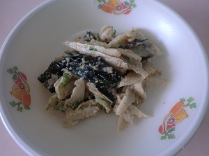 おなじみの「はんだま」はさっとボイルしてごぼうと一緒にサラダにしました。ごまの風味でくせのあるはんだまもおいしくいただくことができました。