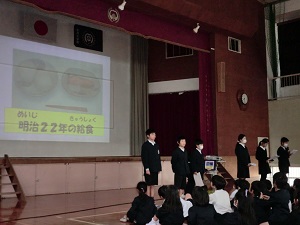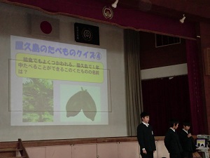 安房小学校では,今朝の児童集会で給食委員会の児童が,給食の歴史や屋久島の食べ物クイズなどを発表してくれました。とてもすばらしい発表でした。