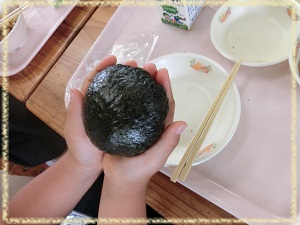 そして,自分の好きな形ににぎります。「ころころころりん」と,ころがっていきそうな丸いおむすびができました。