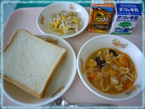今日は,自分でサンドイッチを作るセルフサンドです。具はツナと笹切りごぼうを炒めてマヨネーズで調味した「ツナごぼうソテー」です。ごぼうも調理の工夫で子どもたちの大人気メニューに変身です。ご家庭でもサンドイッチの具にいかがでしょうか?