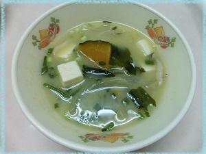 みそ汁は,屋久島のあご(トビウオ)でだしをとり,旬のかぼちゃをたっぷり入れました。