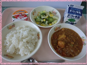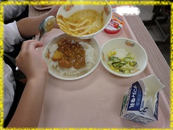 初めての給食は,大人気のカレーライスです。