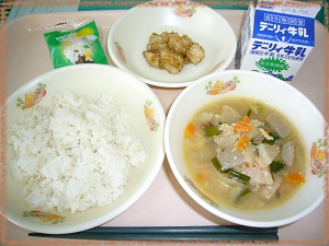 給食も十五夜にあわせて,里芋を使った料理や,屋久島産の新米を使ったメニューです。屋久島では他の地域より早めに新米をいただくことができます。新米は甘みがあり,モチモチとしていておいしかったです。
