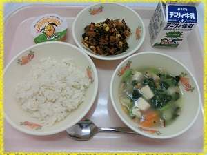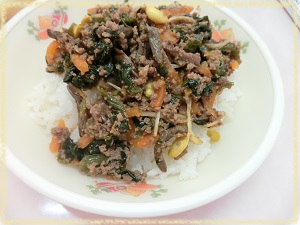 コチュジャンという甘辛いみそで味付けした,肉や野菜をごはんと混ぜながらいただきます。今日は,にんじん・大豆もやし・ほうれん草・ぜんまいが入った野菜たっぷりのビビンバでした。