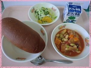今日は「ポークビーンズ」です。豚肉と豆の煮物ですが,ケチャップで味付けしているので豆が苦手な子どもたちも食べやすいようです。
