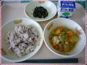 〇ひじきと高菜の炒め物 「雑穀ごはん」には九州で栽培された9種類の雑穀(押し麦・黒米・もち麦・青玄米・大豆・もちきび・もち玄米・赤米・もちあわ)が入っています。