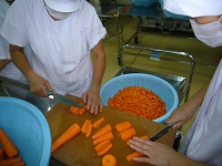 煮物の日は,煮くずれをふせぐために大きさをそろえて丁寧に野菜を切っています。調理員さんたちの愛情いっぱいの今日の煮物はとてもおいしく,見た目も美しく出来上がりました。