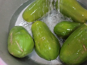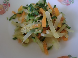 きゅうり・にんじんと一緒に甘酢あえにしました。パパイヤのコリコリとした歯ごたえが特徴の一品です。