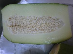 半分にわると,中には種がいっぱいつまっています。種は食べることができないので,とりのぞいてから調理します。