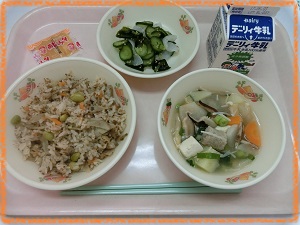 今日は,ゆでたこんにゃく・わかめ・きゅうりにかけていただきました。