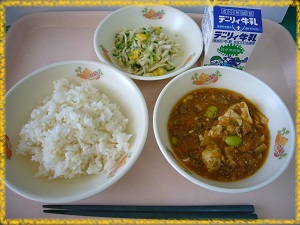 子どもたちは麻婆豆腐をごはんにかけておいしそうに食べています。